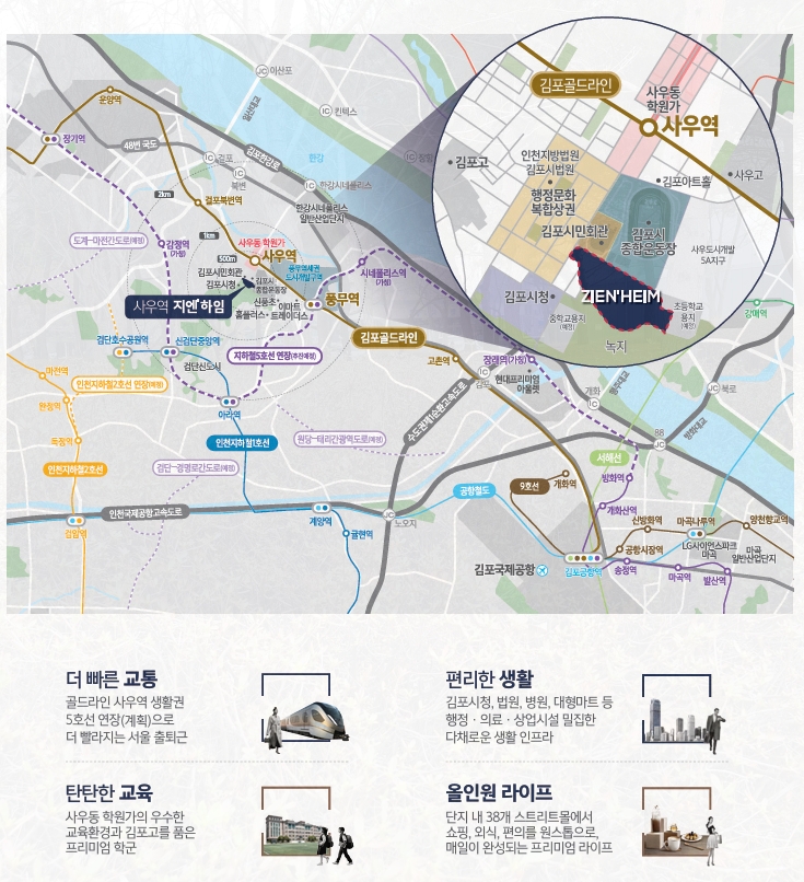 단지는 골드라인(김포도시철도) 사우역 생활권에 위치합니다. 현재 골드라인은 김포공항역에서 서울 지하철 9호선·5호선·공항철도와 환승이 가능한 구조인데요.