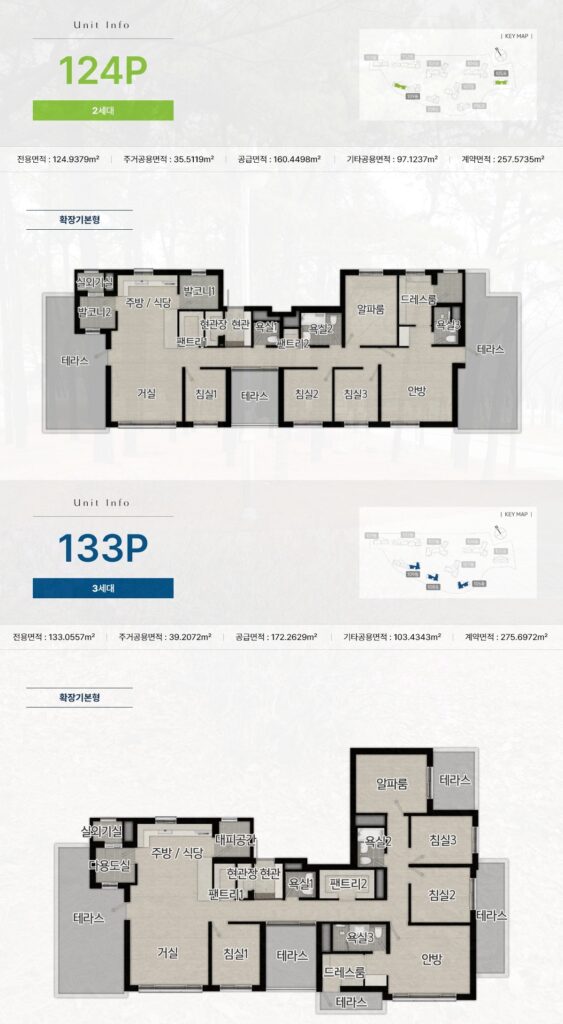 124P(전용 124.9379㎡, 2세대)는 침실 3개·안방·드레스룸·욕실 3개·알파룸·테라스 다수로 구성된 대형 타입입니다. 판트리가 2개 계획되어 있으며, 테라스가 거실·침실·측면 등 여러 방향에 연결된 구조입니다.