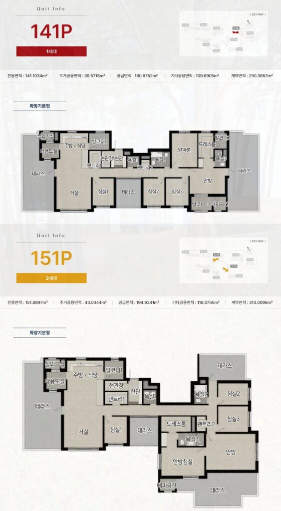 141P(전용 141.1034㎡, 1세대)와 151P(전용 151.8897㎡, 2세대)는 단지 내 최상위 면적 타입으로, 다용도실·실외기실·대피공간·테라스가 복합적으로 구성되어 있습니다.